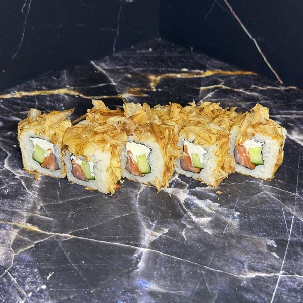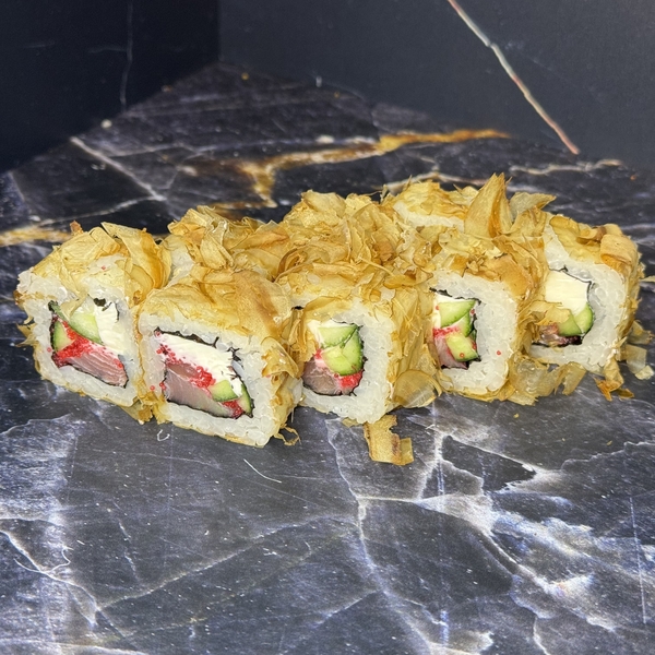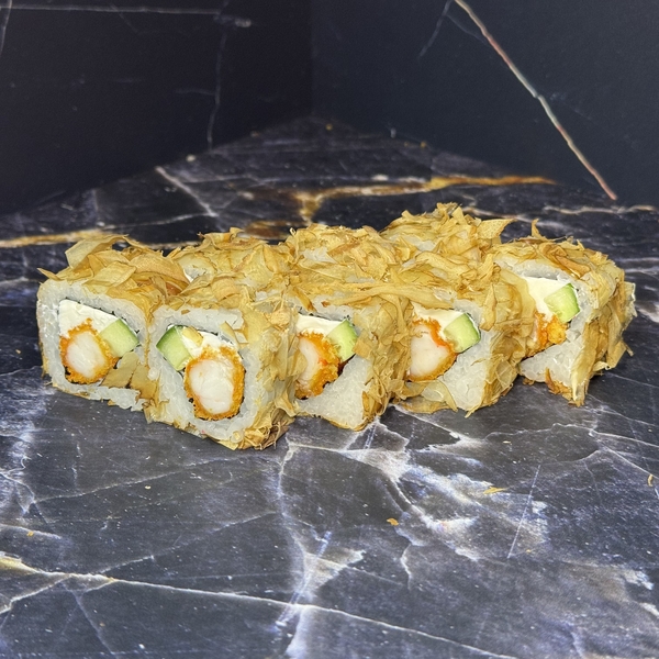 Креветка темпура, Рис, Нори, Креметте, Огурец, Бонито.