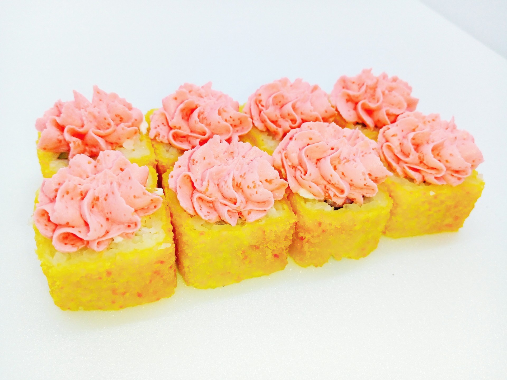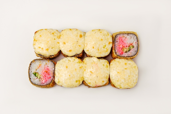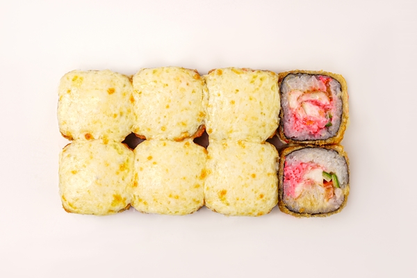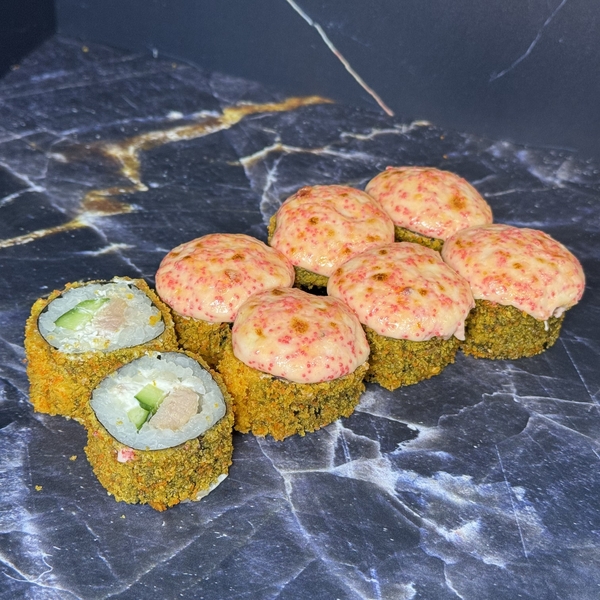 Тунец, Рис, Нори, Креметте, Огурец, Кляр, Панко, Шапочка моцарелла с масаго.