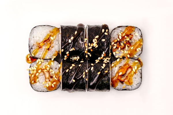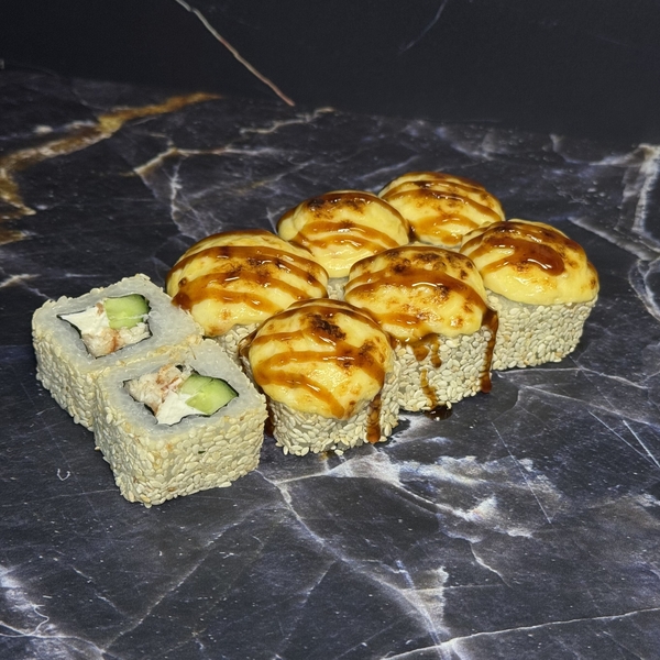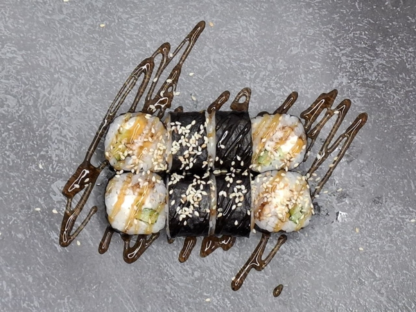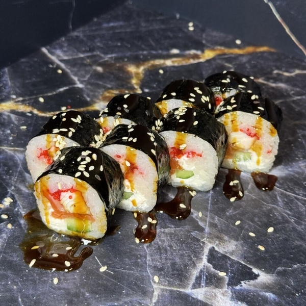 Угорь, Рис, Нори, Креметте, Огурец, Кунжут, Шапочка моцарелла, Терияки.