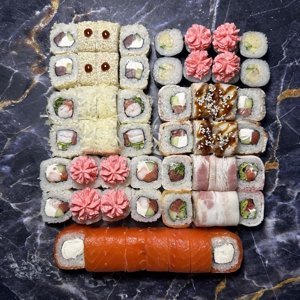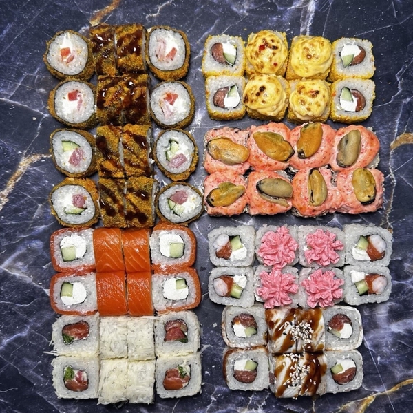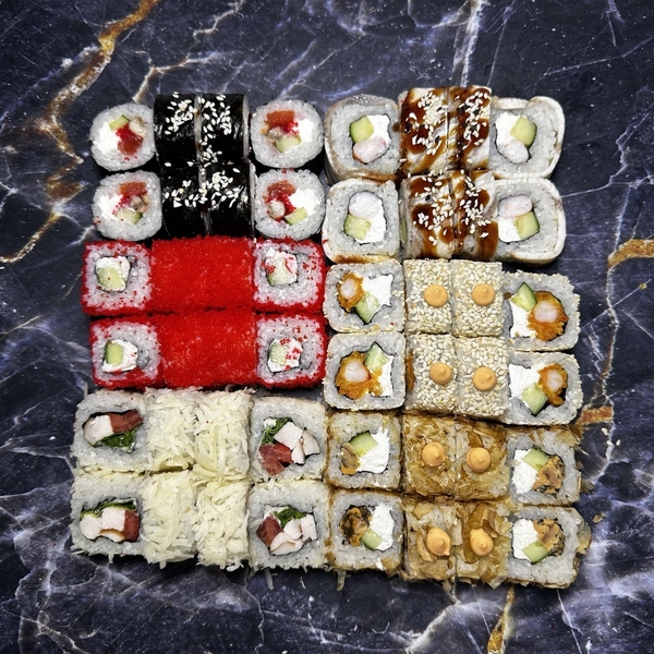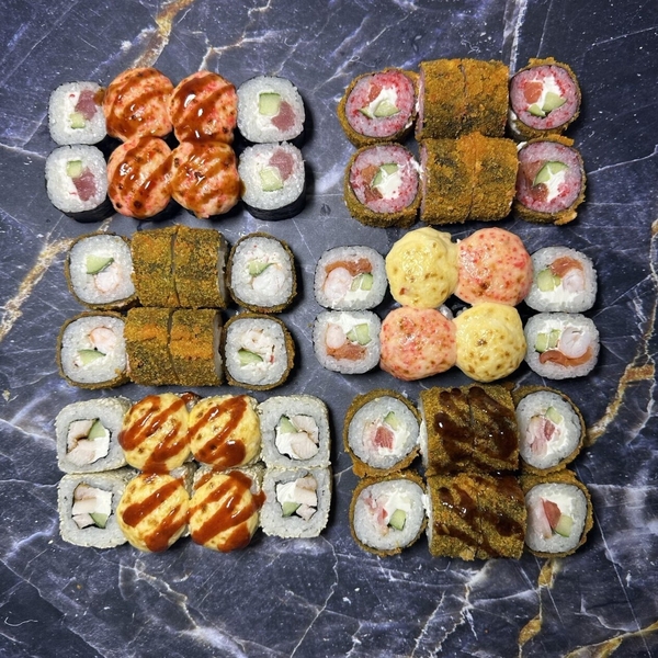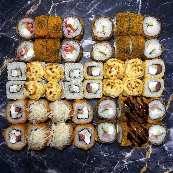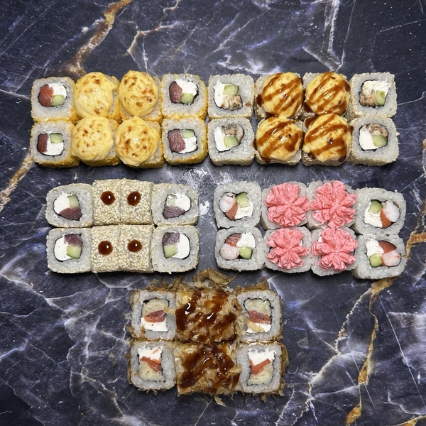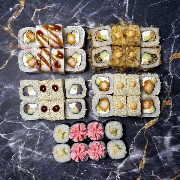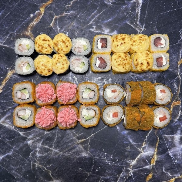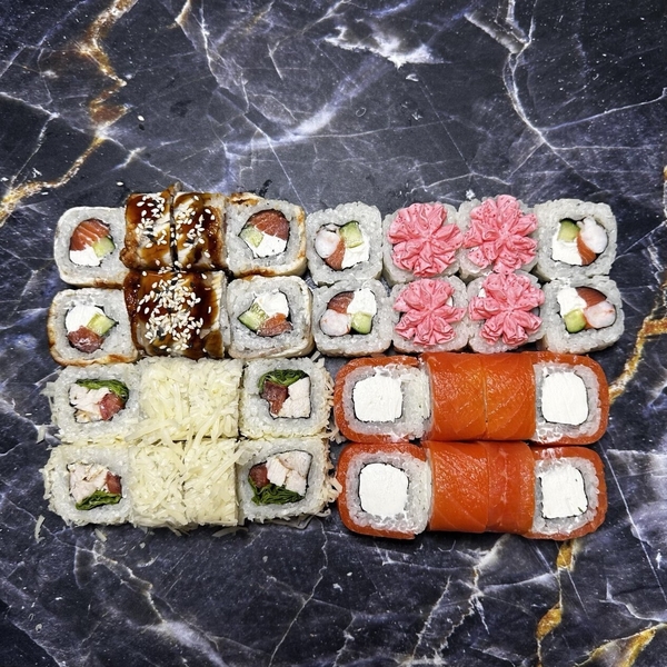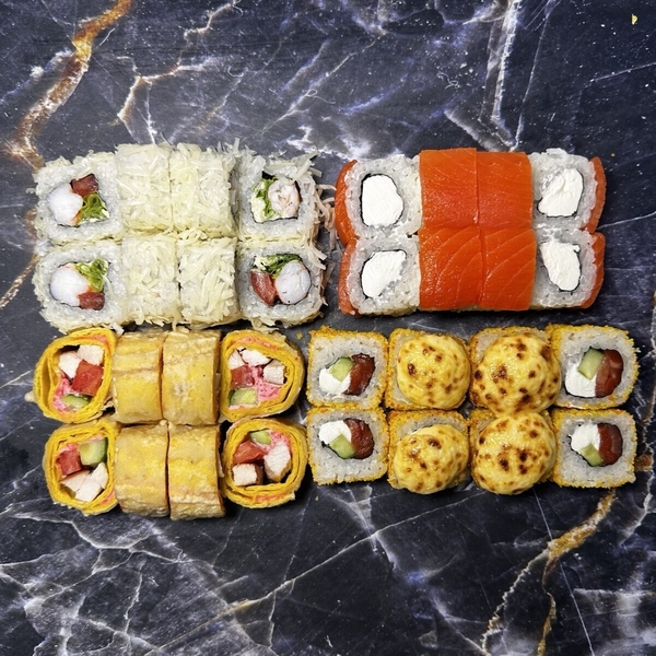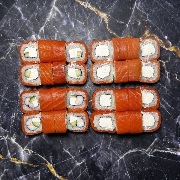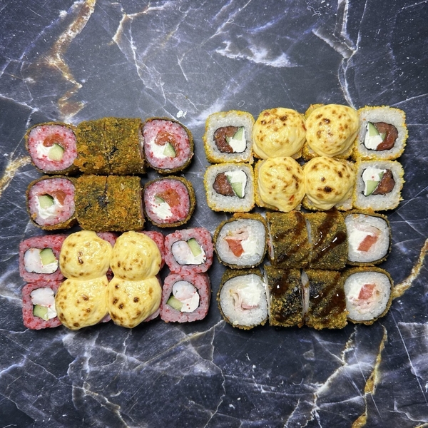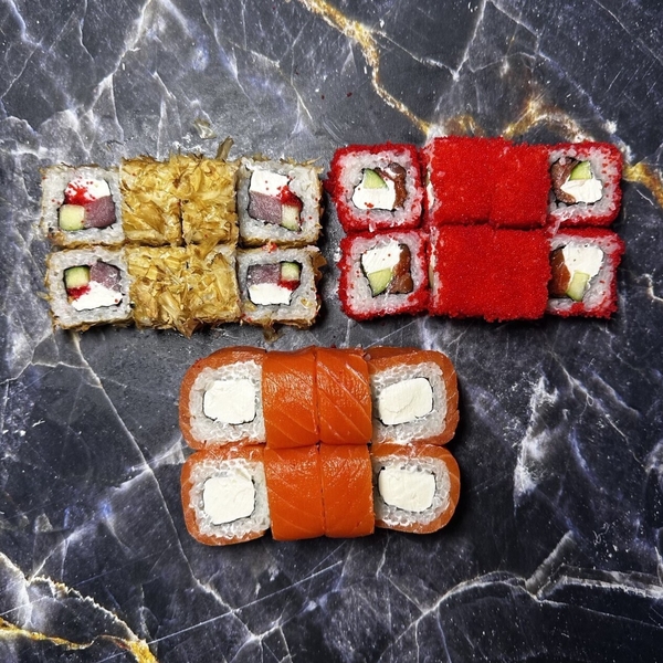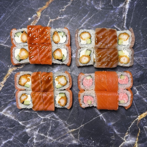 Филадельфия с огурцом, Цезарь с форелью, Лава ролл, Канада с форелью, Магуро темпура, Бекон темпура, Сяке гриль, Муругай гриль, Имбирь 4шт, Васаби 4шт, Соевый соус 4шт.