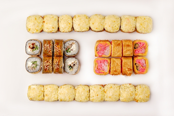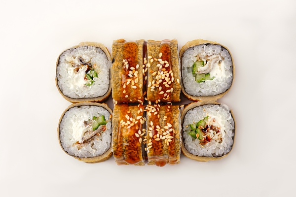 Нори, Рис, Креметте, Огурец, Форель, Угорь, Масаго, Терияки, Кунжут, Кляр, Панко.