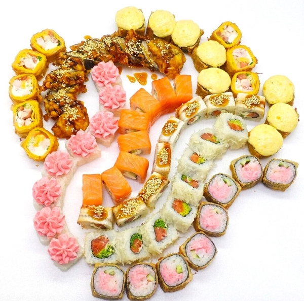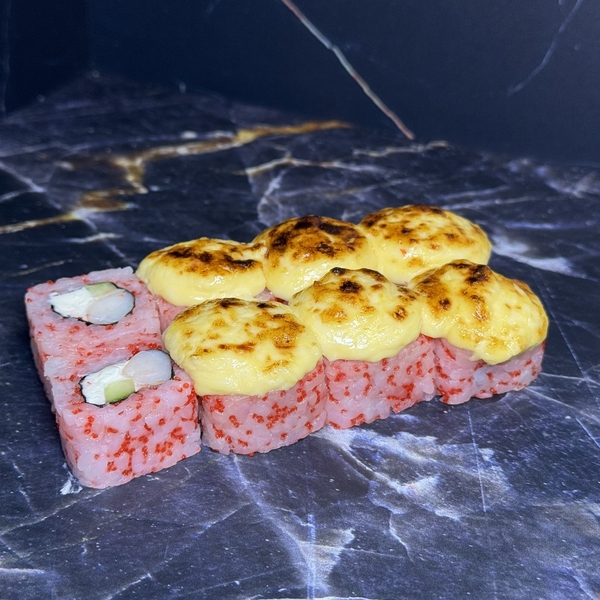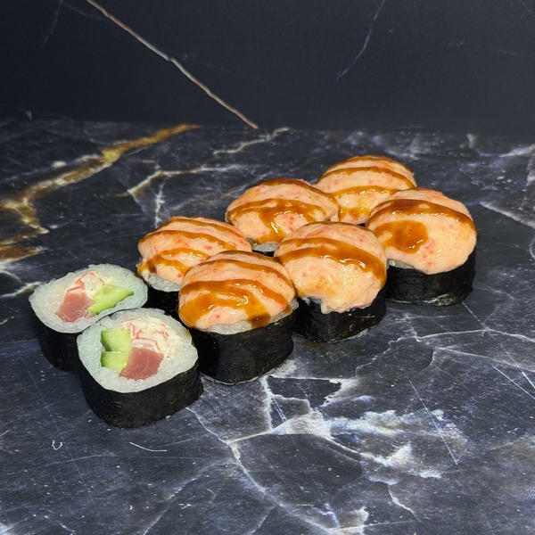 Тунец, Снежный краб, Рис, Нори, Огурец, Шапочка моцарелла с масаго, Терияки.