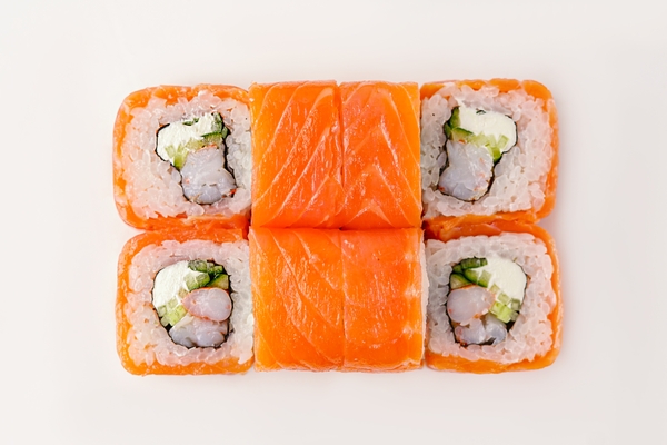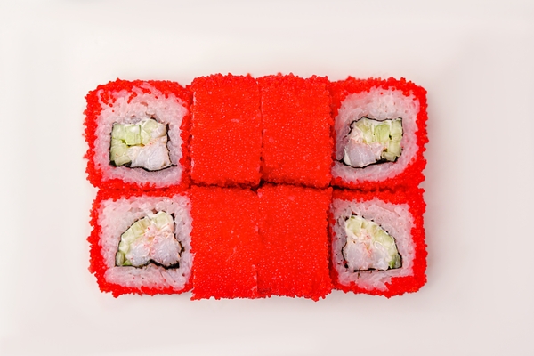 Креветка, Форель х/к, Рис, Нори, Креметте, Огурец, Шапочка моцарелла, Шапочка моцарелла с масаго.