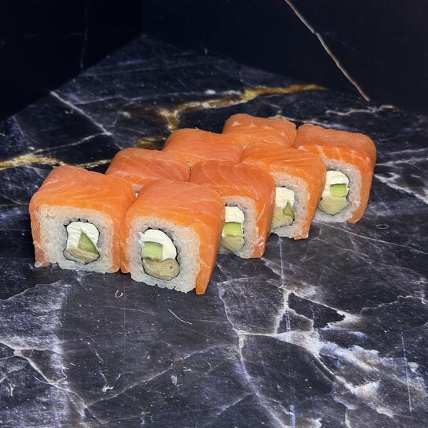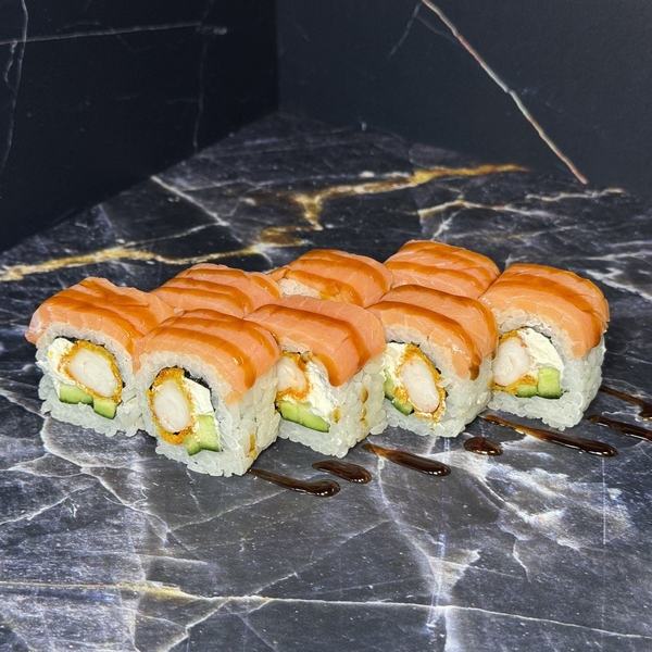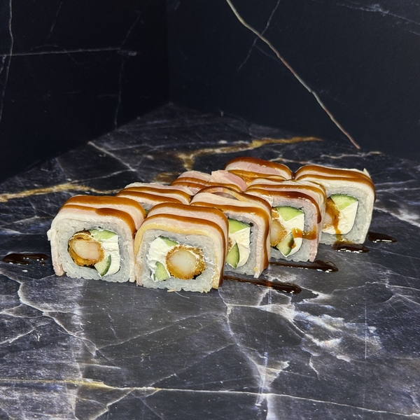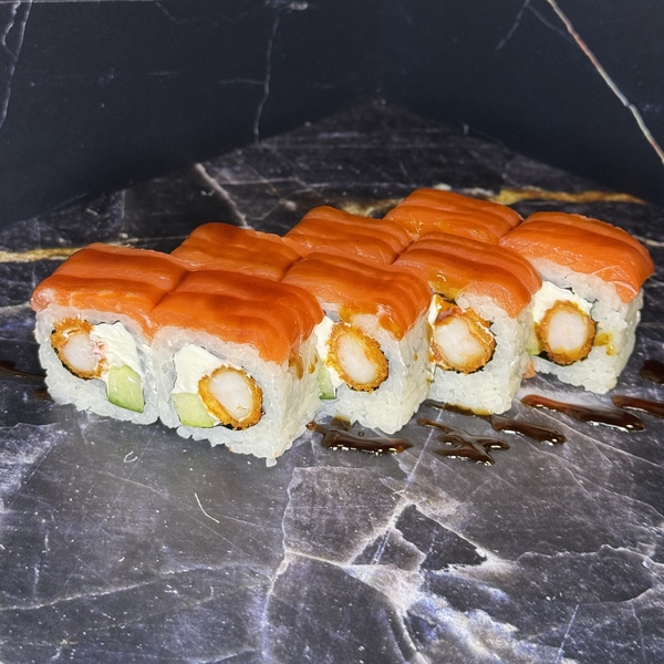Форель х/к, Креветка темпура, Рис, Нори, Креметте, Огурец, Терияки.