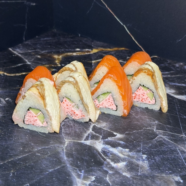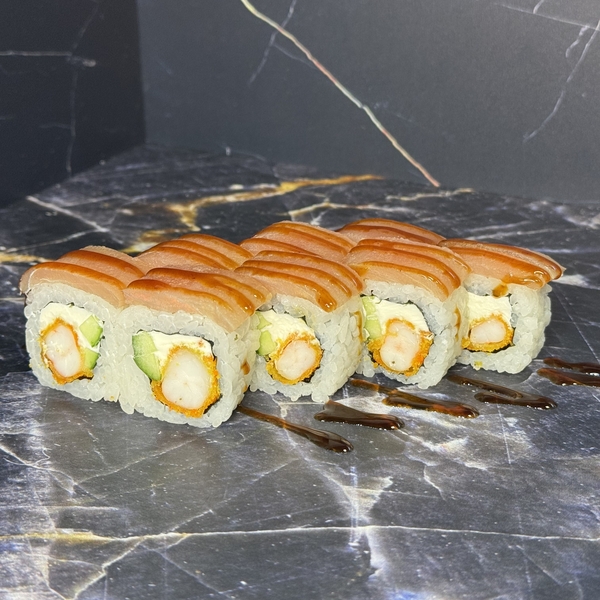 Форель, Креветка темпура, Рис, Нори, Креметте, Огурец, Терияки.