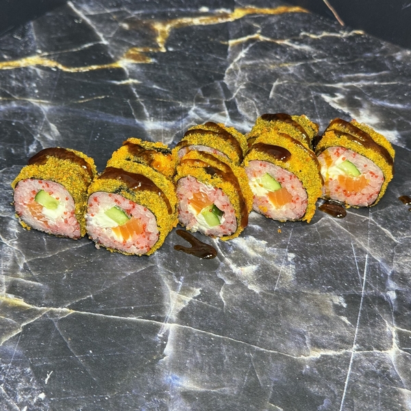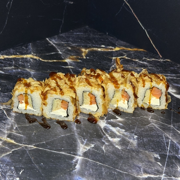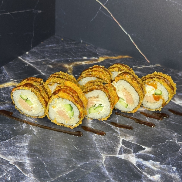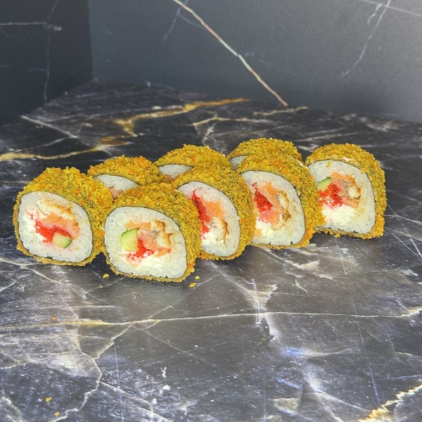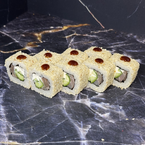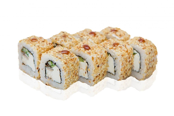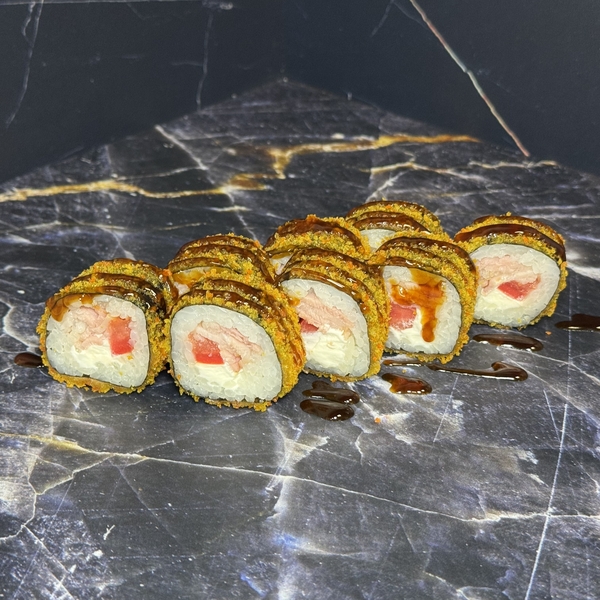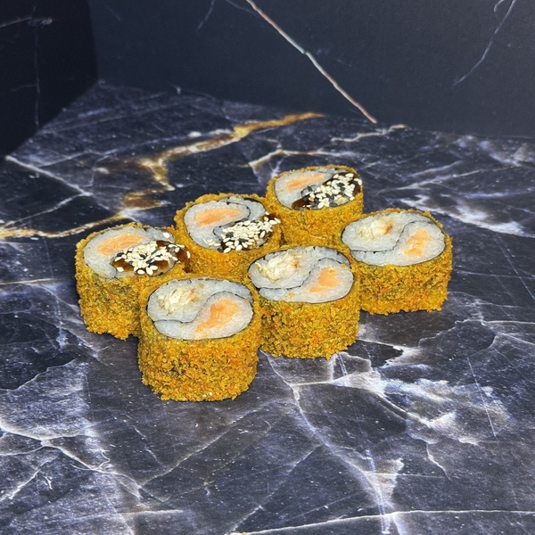 Угорь, Креметте, Огурец, Рис, Нори, Соус унаги, Кунжут, Кляр, Панко.