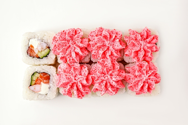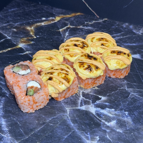 Форель, Рис, Нори, Креметте, Огурец, Масаго, Шапочка моцарелла, Соус спайси.