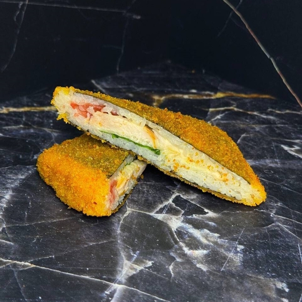 Курица, Креметте, Рис, Помидор, Соус цезарь, Нори, Пармезан, Кляр, Панко.