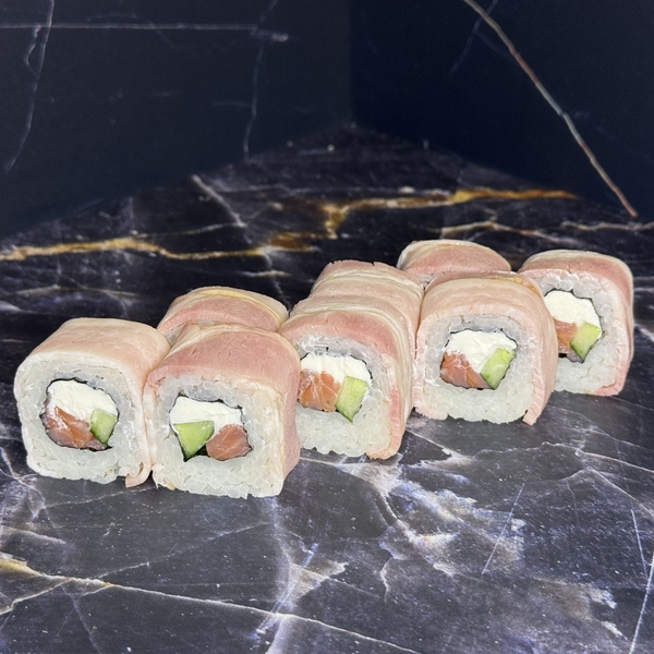 Форель х/к, Бекон, Рис, Нори, Креметте, Огурец.