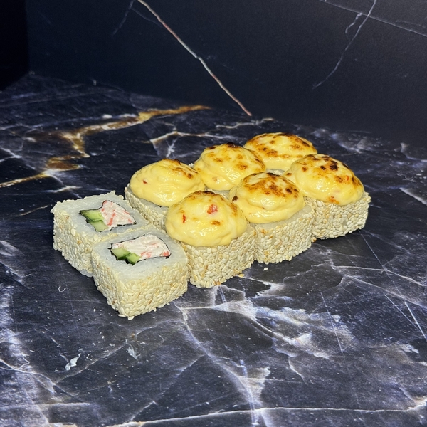 Снежный краб, Рис, Нори, Огурец, Кунжут, Шапочка моцарелла.