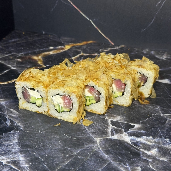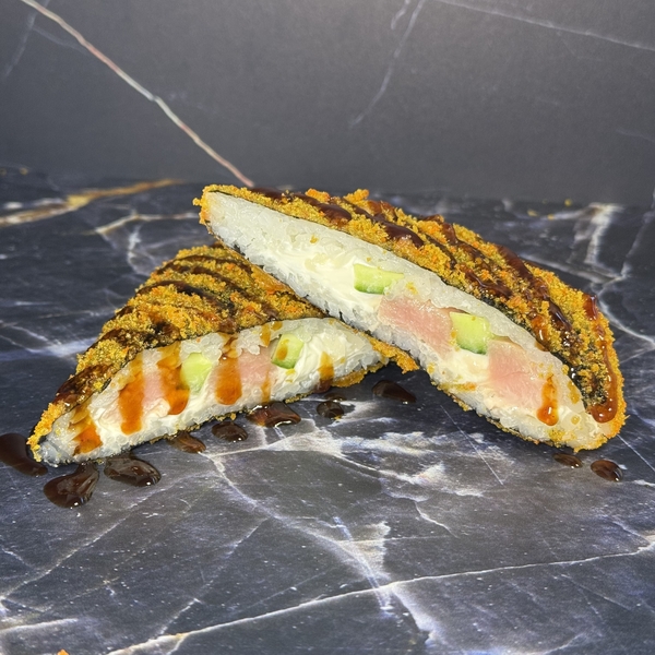 Тунец, Рис, Нори. Креметте, Огурец, Кляр, Панко, Терияки.