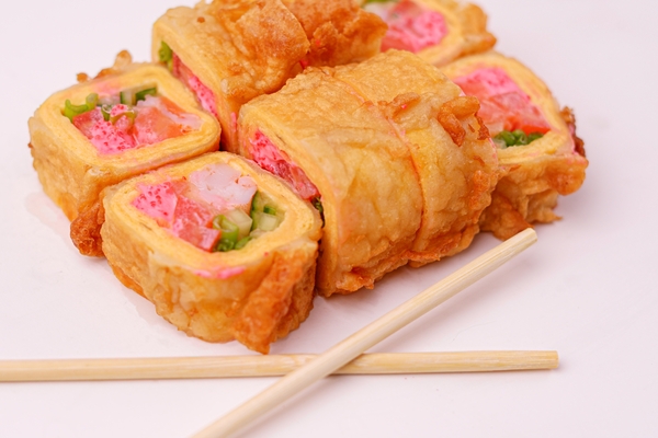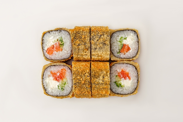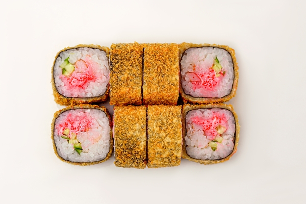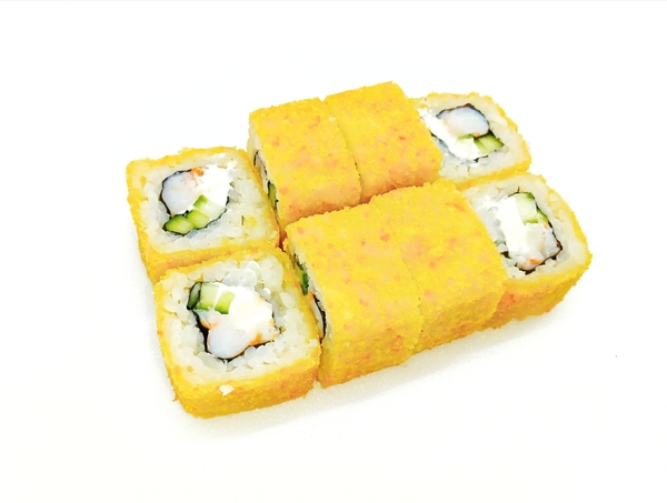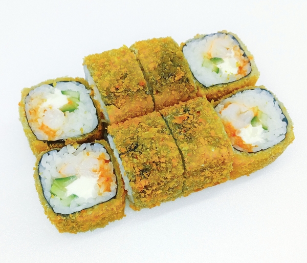 Форель, Огурец, Креметте, Рис, Нори, Шапочка моцарелла, Кляр, Панко.