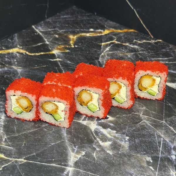 Креветка темпура, Рис, Нори, Креметте, Огурец, Масаго.