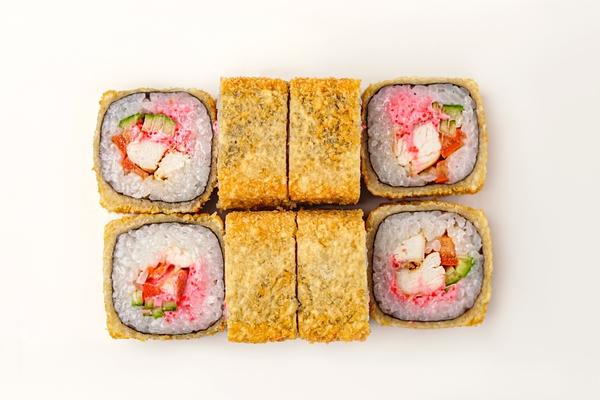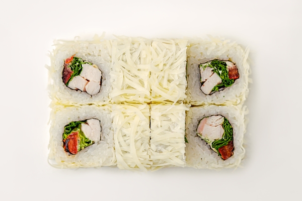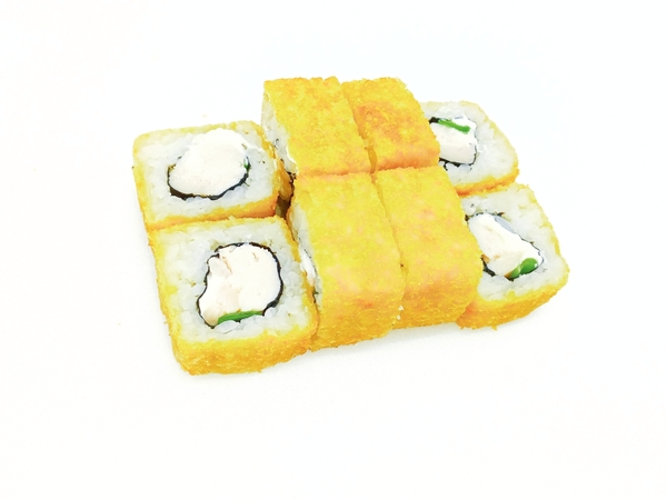 Курица, Рис, Нори, Помидор, Соус цезарь, Пармезан, Лист салата, Кляр, Панко.