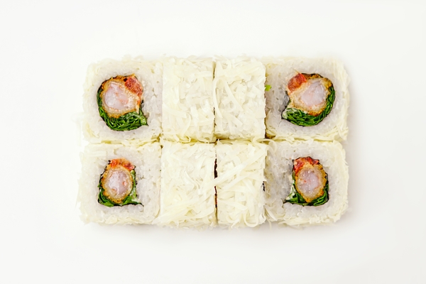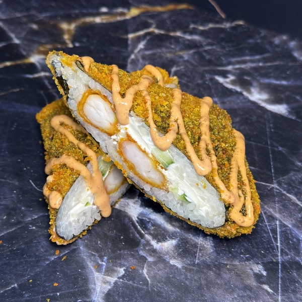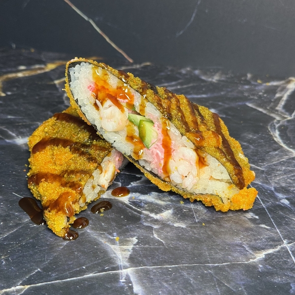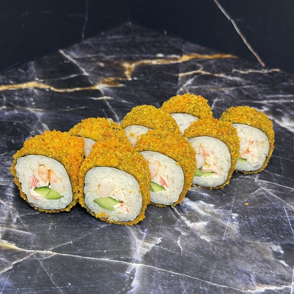 Креветка, Рис, Огурец, Креметте, Нори, Соус спайси, Кляр, Панко.