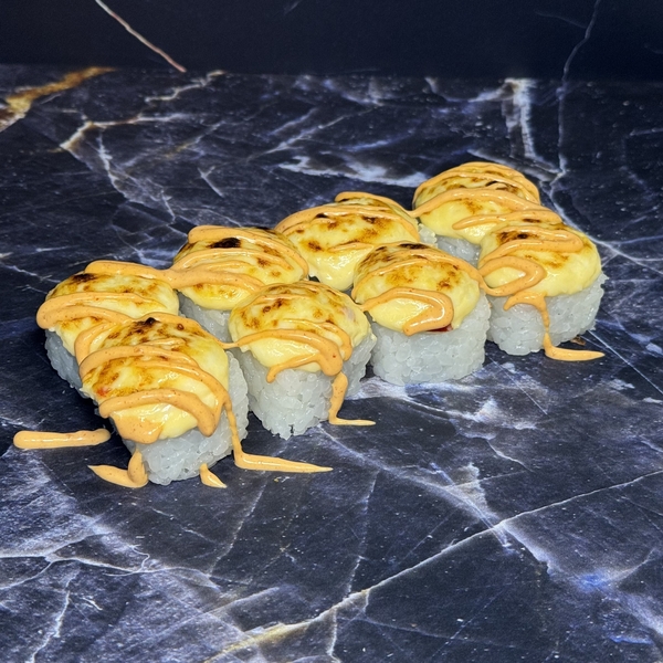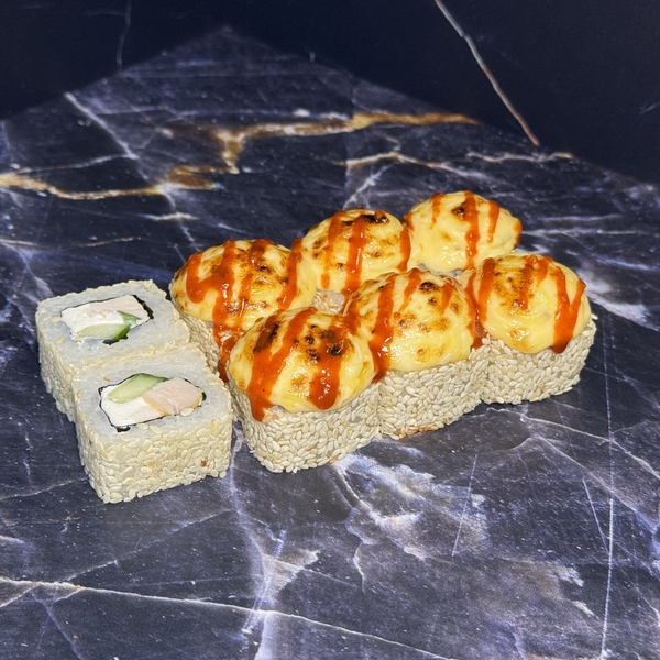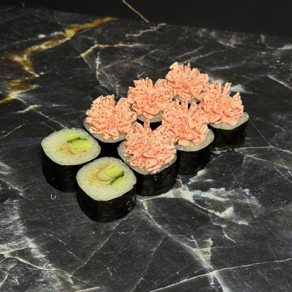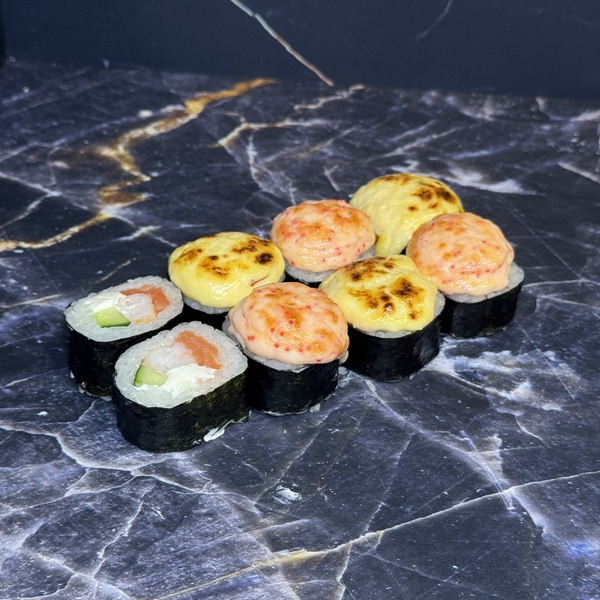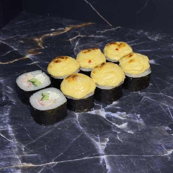 Креветка, Рис, Нори, Креметте, Огурец, Шапочка моцарелла, Соус спайси.