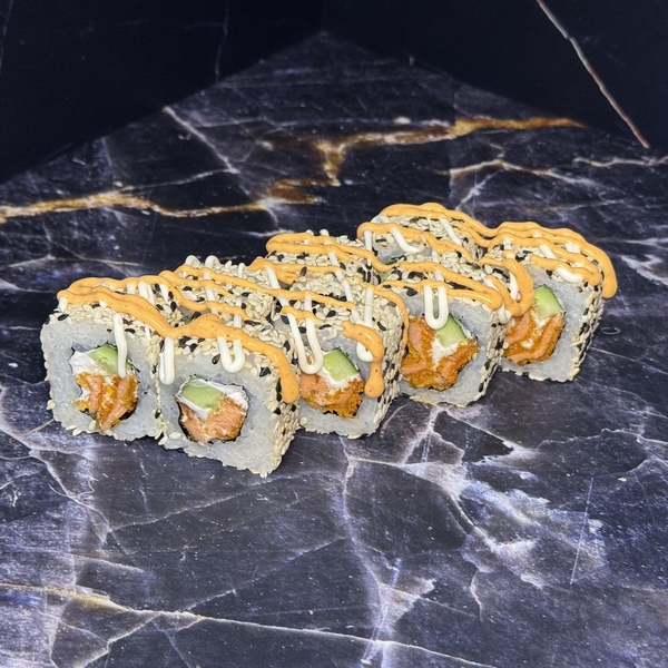 Форель темпура, Рис, Нори, Креметте, Огурец, Кунжут, Майонез, Соус спайси.