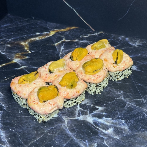 Мидии, Рис, Нори, Креметте, Огурец, Бонито, Соус спайси.