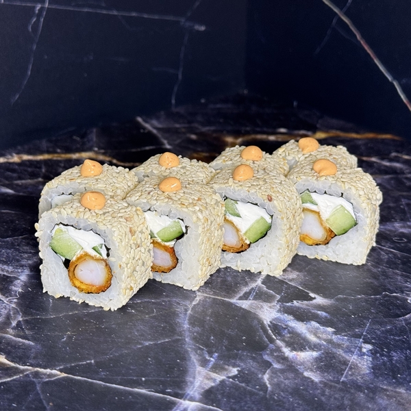 Креветка темпура, Рис, Нори, Креметте, Огурец, Кунжут, Соус спайси.